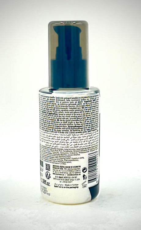 - مقدار مناسب از سرم مو میلک تراپی مورفوس (1 تا 3 پمپ، بسته به حجم مو) را روی کف دست پخش کنید.