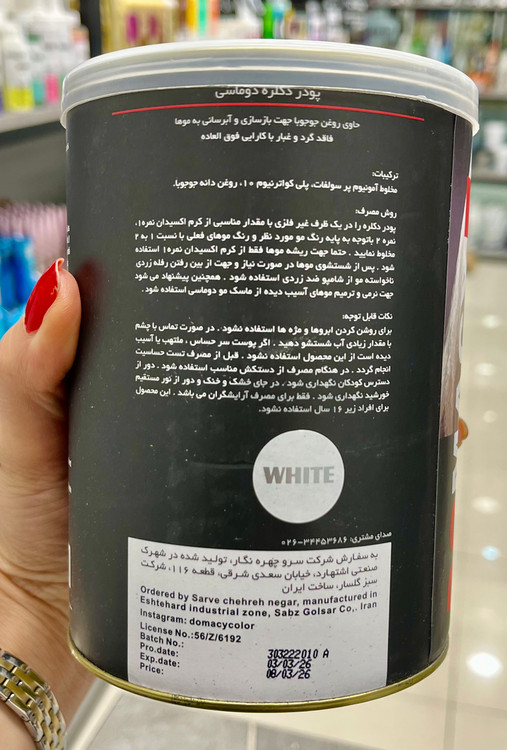 پودر دکلره آبی و سفید دوماسی حاوی روغن جوجوبا جهت با. سازی و آبرسانی به مو ها فاقد گردوغبار با کارایی فوق العاده ساخت کشور ایران .