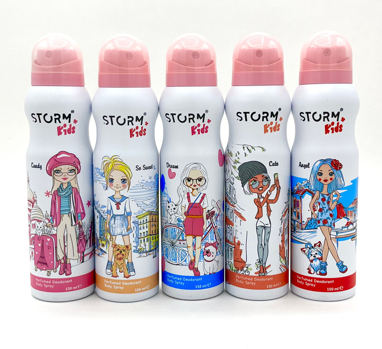اسپریهای استورم کیدز در مدلهای مختلف با طرحهایی مانند دخترانه فشن، سگ اسکیتبردسوار، کوسه کارتونی، دختر فانتزی و… تولید میشوند و هر مدل رایحه مخصوص به خود را دارد. حجم ۱۵۰ میلیلیتری آنها نیز بسیار مناسب و مقرونبهصرفه برای استفاده روزمره است.